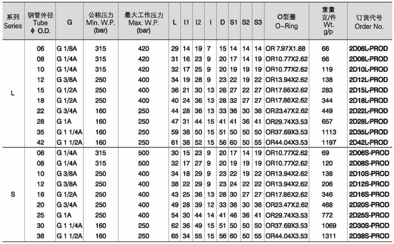 不带螺母和卡套时的订货代号示例:2D10L-PRODX